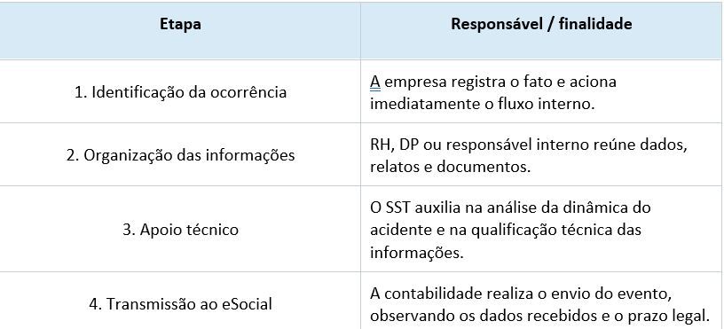 O ideal é que a empresa tenha um fluxo interno claro e bem definido. Isso traz mais segurança jurídica ao empregador, melhora a qualidade das informações prestadas e assegura um tratamento mais adequado ao trabalhador envolvido na ocorrência.